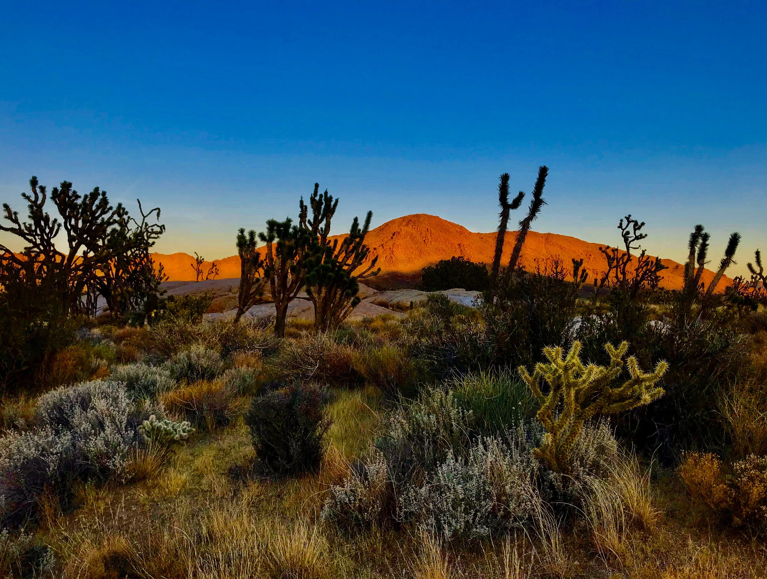 I reach the top of Teutonia and everything is still. At summits back East, I’m used to a rush of cold wind and a scramble to layer my body in fleece. Here, the heat must have put the wind to sleep. I look out. The landscape glows red. But when you look closely, you can still see the Joshua trees and the shrubs and even the wildflowers, who know more about survival than you ever will. There’s lushness to this desert.